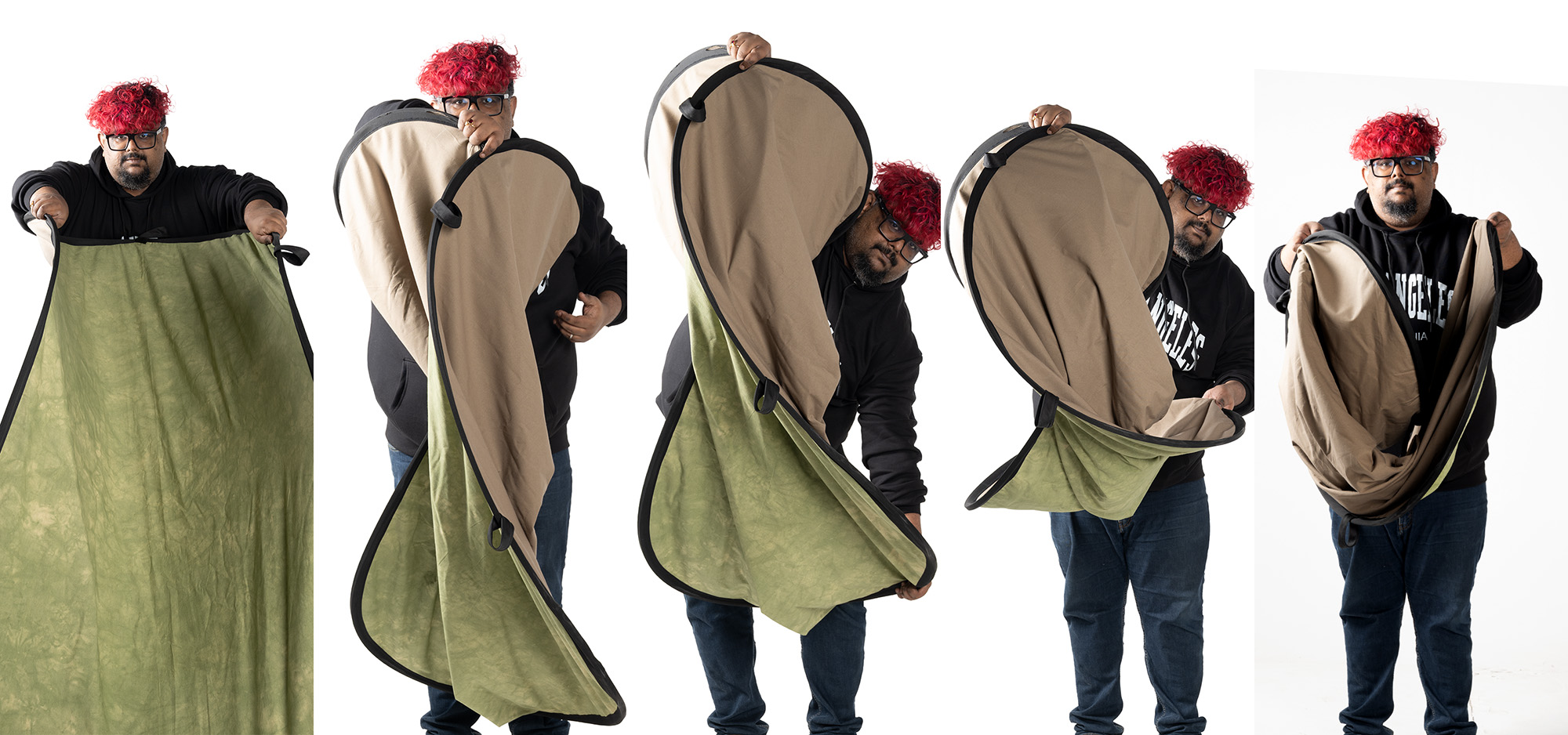 Folding the collapsible backdrop is simple and quick. You can hold both sides of the frame and bring the edges together to form a V shape. The frame then collapses naturally inward, and then you just have to fold the bottom section upward into a compact circle. Alternating the folding side each time helps the backdrop maintain its durability for years of use.
